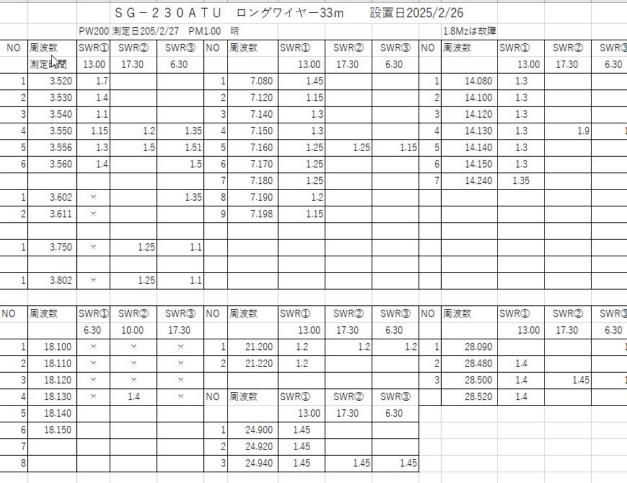 各バンドのSWRを測定、環境、天候、朝昼晩によって変化してる。