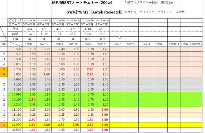 各バンドのSWRを測定、環境、天候、朝昼晩によって変化してる。