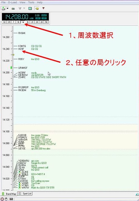 ■2.左上段の任意の周波数を選択(画面は14MHZ選択)